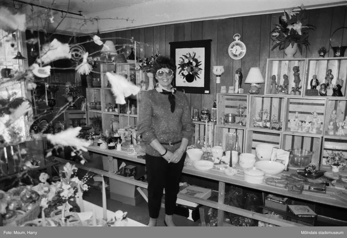 Eivor Andersson i sin presentaffär vid Sagbrovägen i Lindome, år 1984. "Eivors i Lindome kan nu fira 5-årsjubileum."
