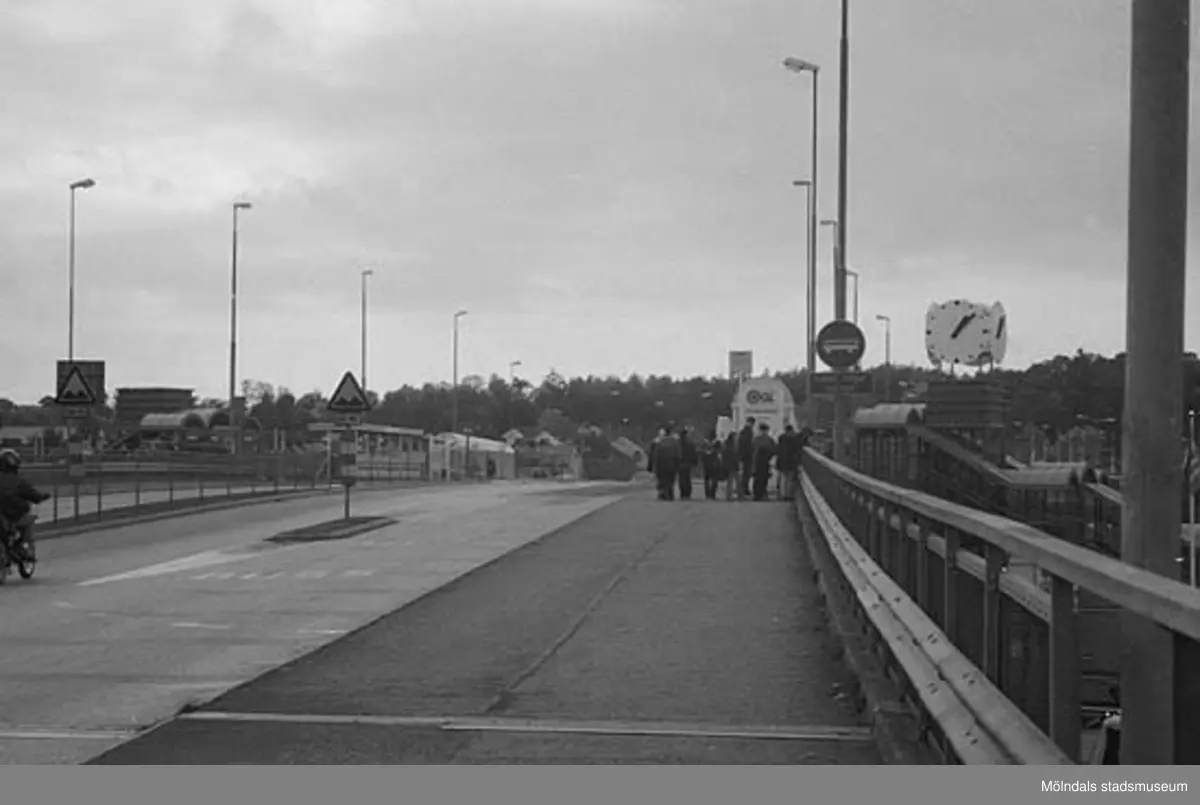 Människor som går på en bro. Mölndalsbro i dag - ett skolpedagogiskt dokumentationsprojekt på Mölndals museum under oktober 1996. 1996_0950-0965 är gjorda av högstadieelever från Kvarnbyskolan 9A, grupp 3. Se även 1996_0913-0940, gruppbilder på klasserna 1996_1382-1405 samt bilder från den färdiga utställningen 1996_1358-1381.