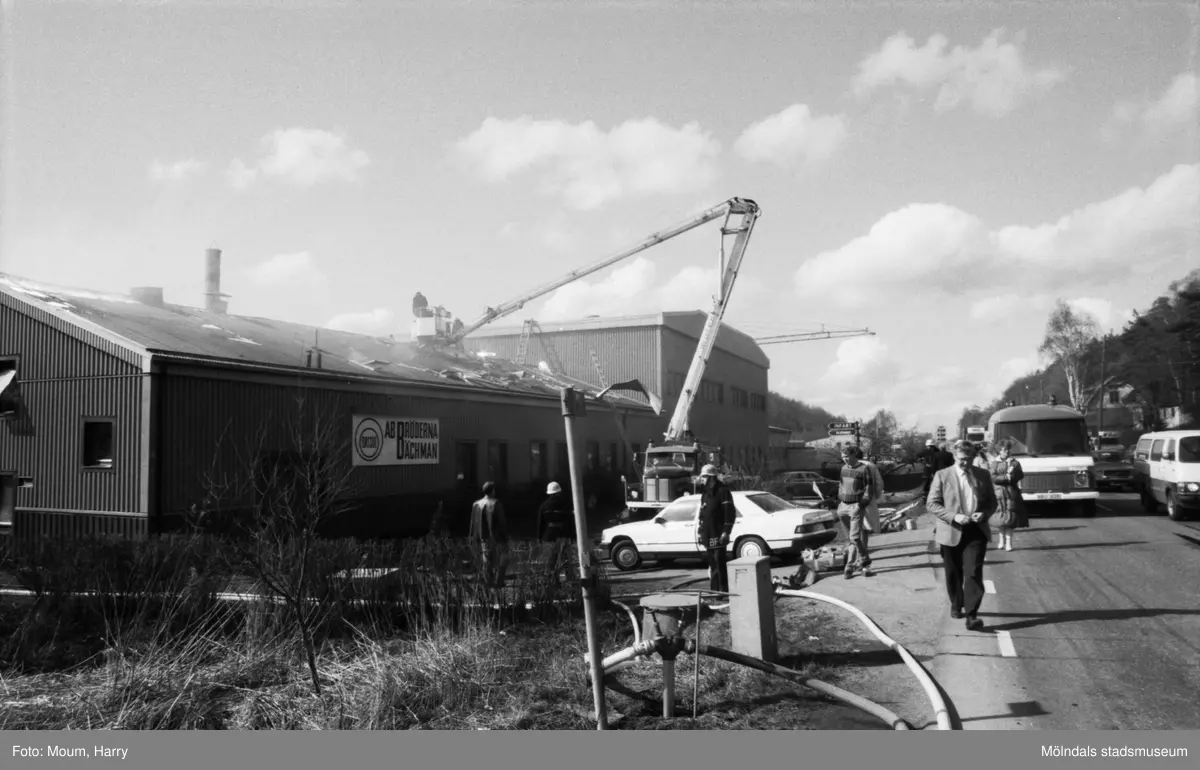 Titel: Brandkåren släcker brand i Bröderna Bäckmans industrilokal vid Gamla Riksvägen i Kållered, år 1984. För mer information om bilden se under tilläggsinformation.