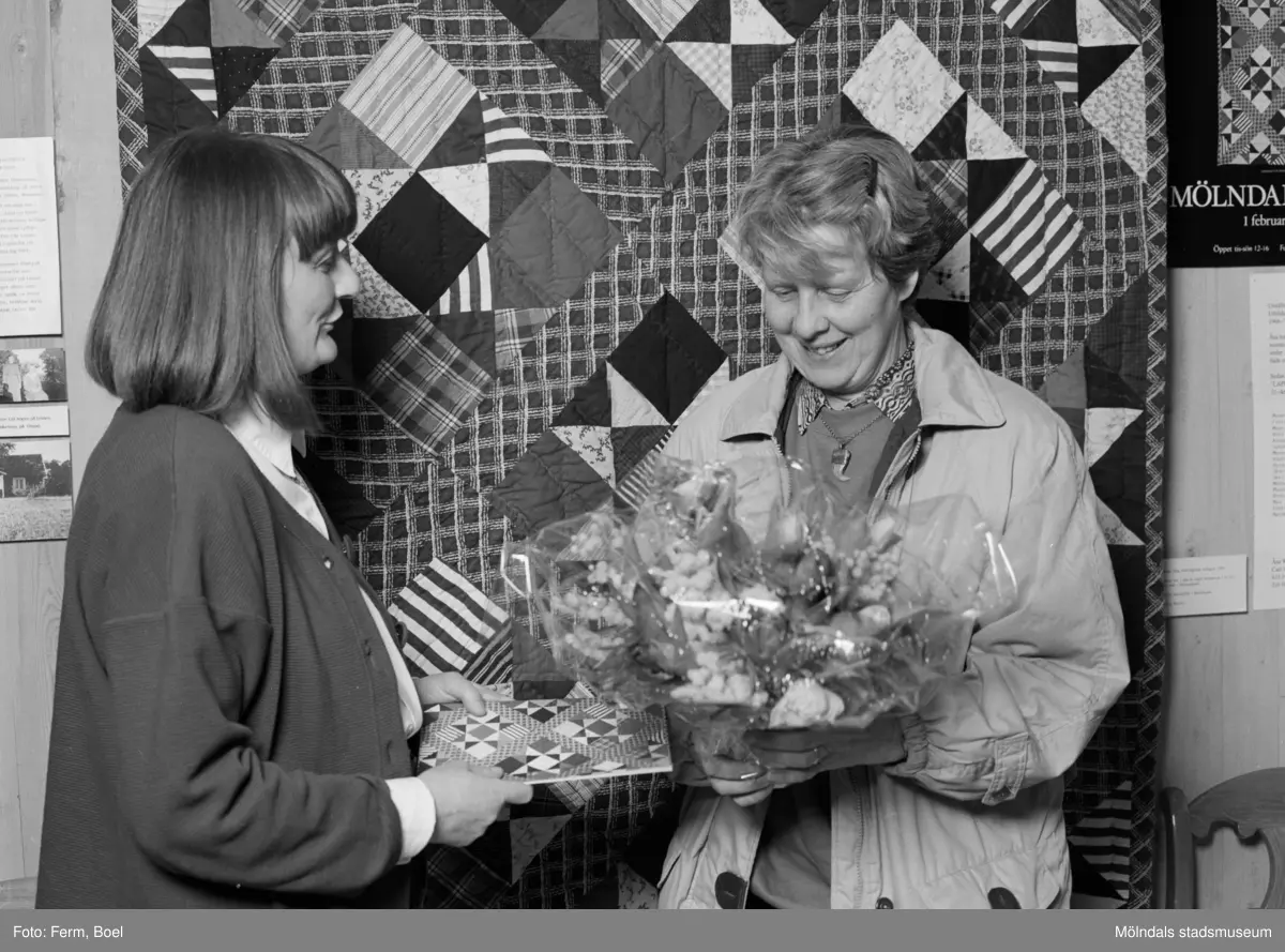 Titel: Interiörbilder från Mölndals Museums utställning "Lapptäcken, en kulturskatt" 1 feb - 29 mars 1992. Mari-Louise Olsson, museichef (1987-2008) och den 5000:e besökaren, Gertrud Eide.