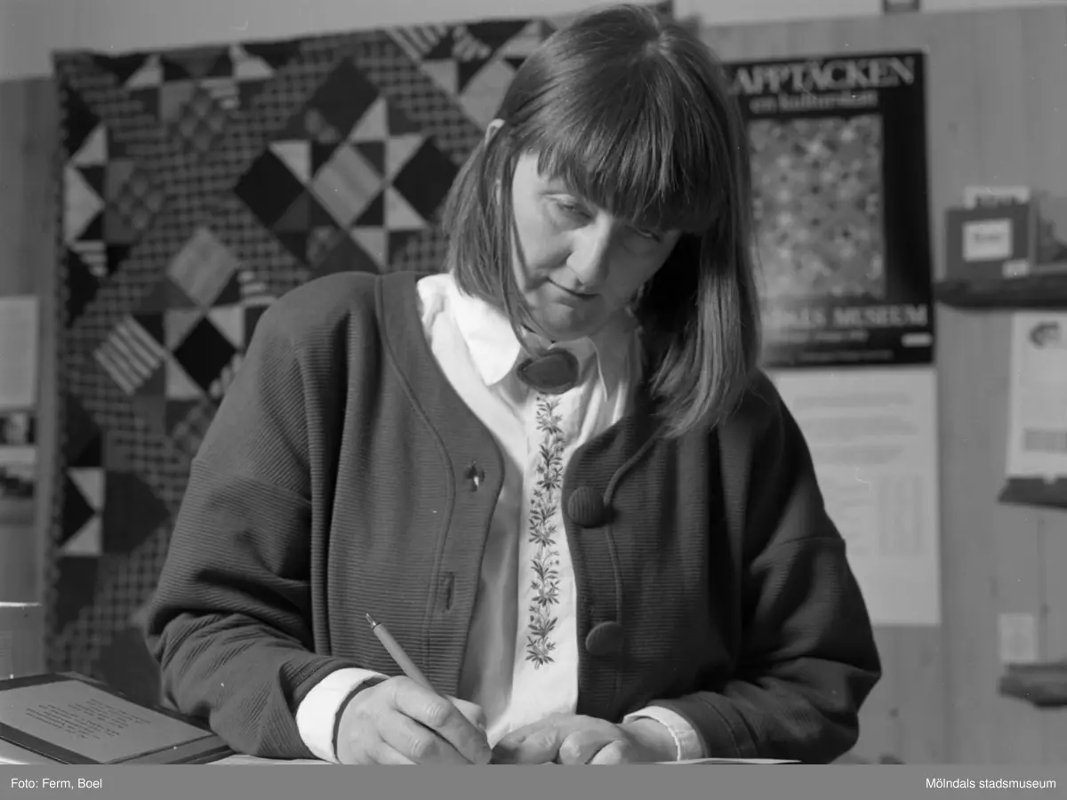 Mari-Louise Olsson (museichef 1987-2008). Interiör från Mölndals Museums utställning "Lapptäcken, en kulturskatt" 1 feb - 29 mars 1992.