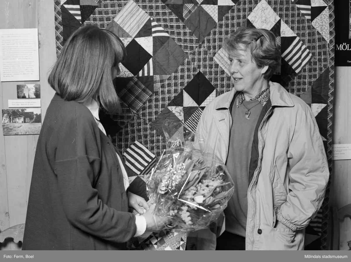 Interiörbilder från Mölndals Museums utställning "Lapptäcken, en kulturskatt" 1 feb - 29 mars 1992. Mari-Louise Olsson, museichef (1987-2008) och den 5000:e besökaren, Gertrud Eide.