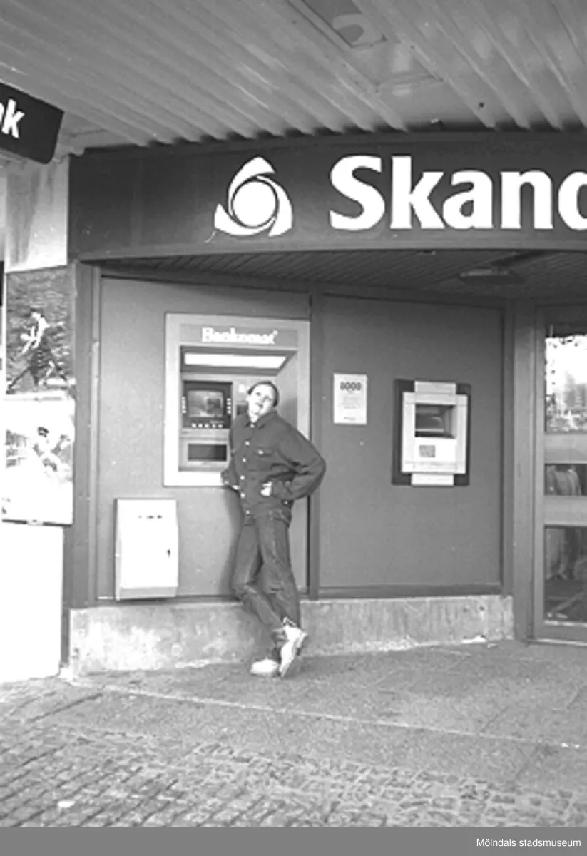 En kille står framför en Bankomat som är placerad utanför Skandinaviska Enskilda banken. Mölndalsbro i dag - ett skolpedagogiskt dokumentationsprojekt på Mölndals museum under oktober 1996. 1996_1061-1076 är gjorda av högstadieelever från Kvarnbyskolan 9C, grupp 3. Se även 1996_0913-0940, gruppbilder på klasserna 1996_1382-1405 samt bilder från den färdiga utställningen 1996_1358-1381.