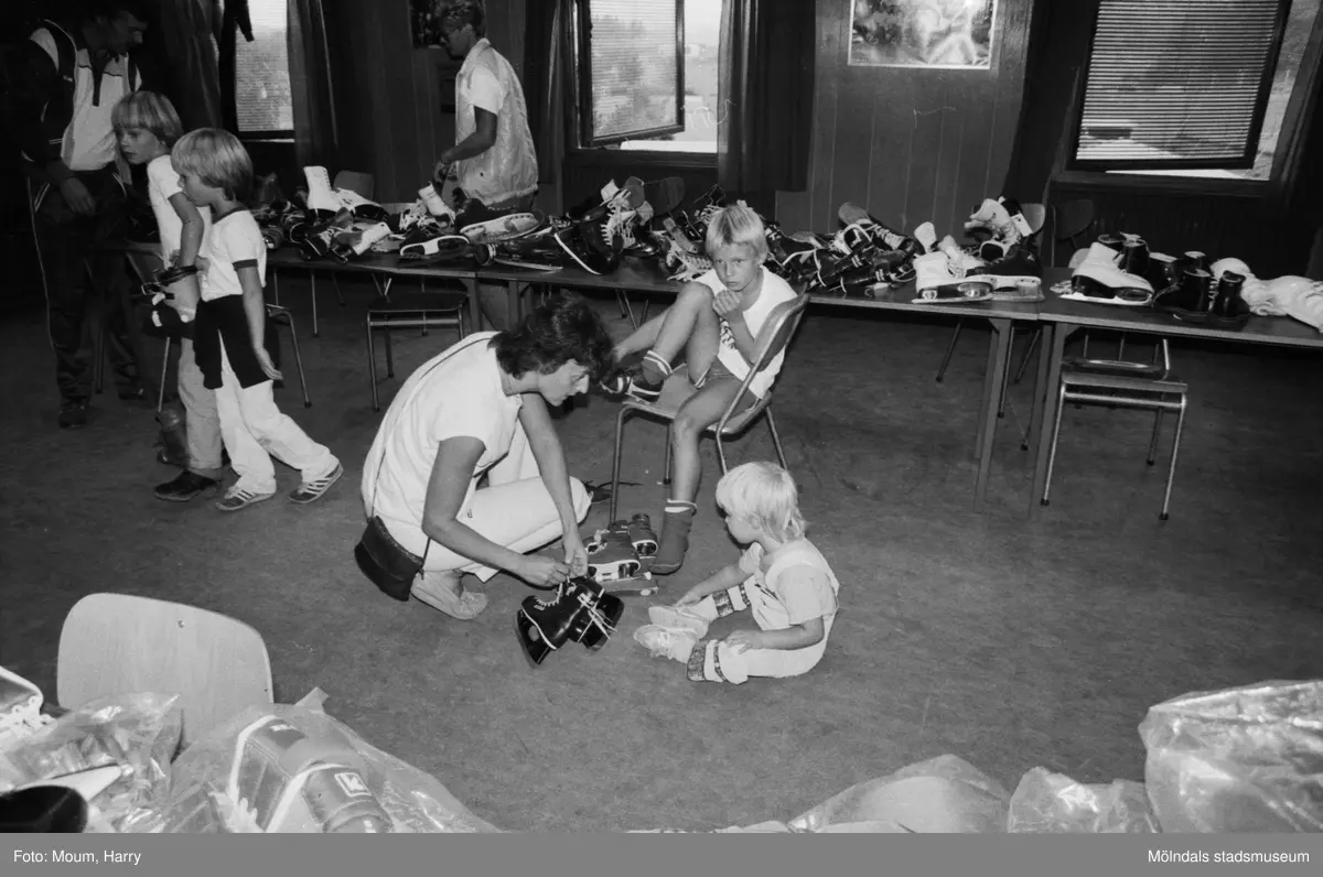 Kållereds Sportklubb anordnar bytardag i klubbhuset på Stretered, år 1983. "Marie Louise Heimer och barnen i bytartagen."
