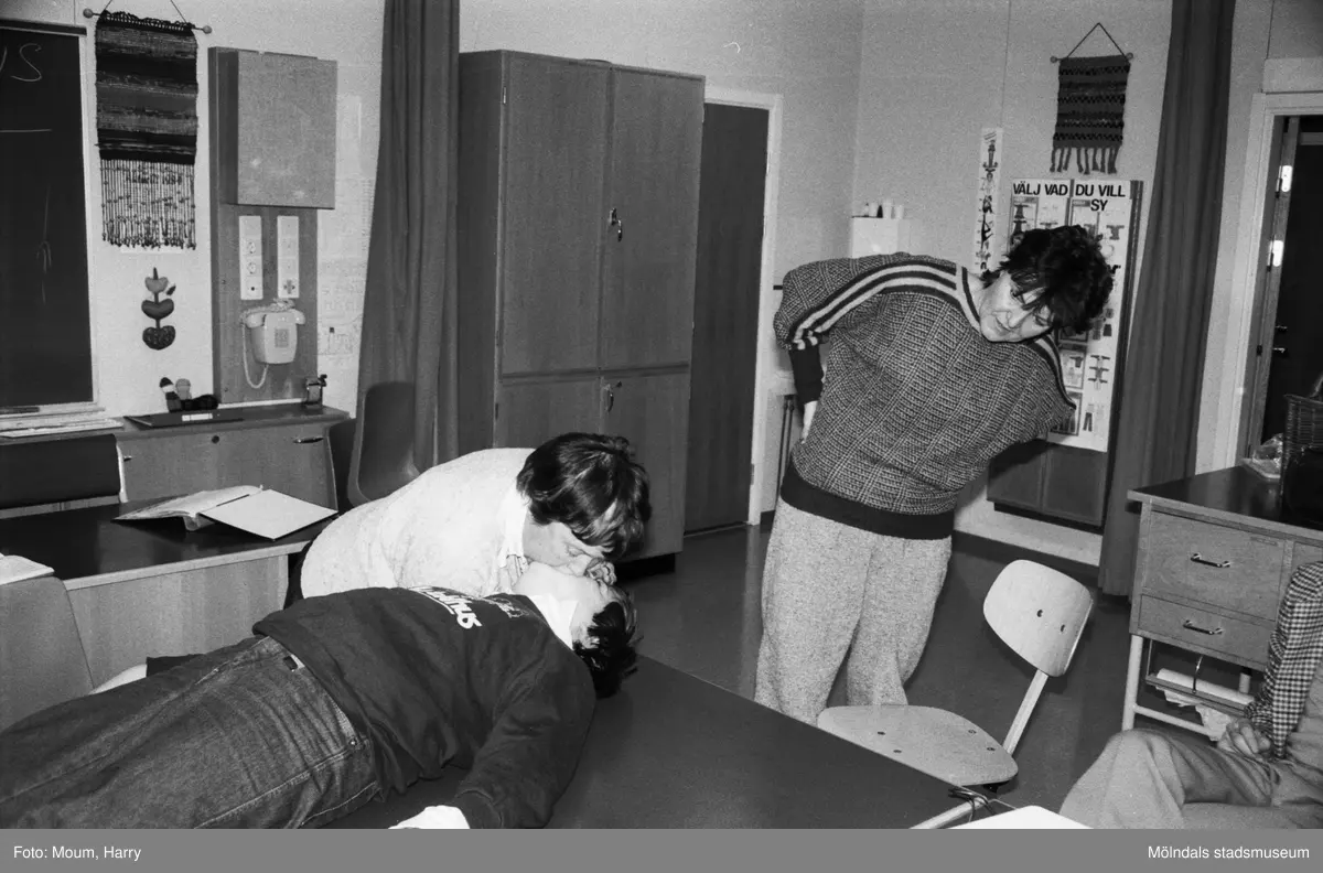Kållereds Röda Kors arrangerar livräddningskurs i Hallenskolan, Kållered, år 1984.