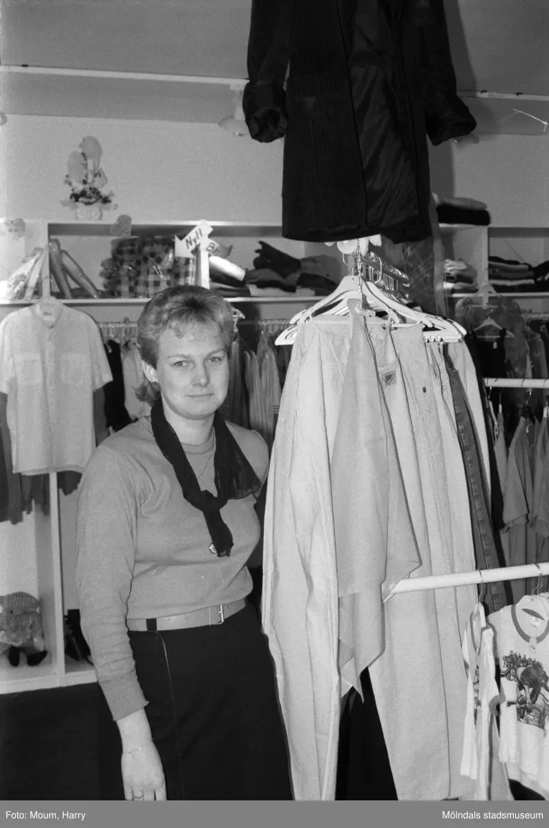 Nya klädaffären "Klara Blå" i Lindome centrum, år 1985. "Martina Björkman har öppnat affär i Lindome."