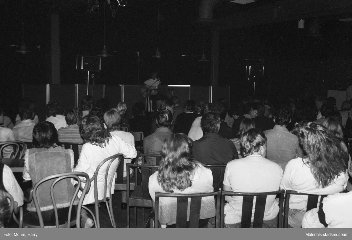 Cornelis Vreeswijk uppträder på Almåsgården i Lindome, år 1983. Anders Hellström på scen.