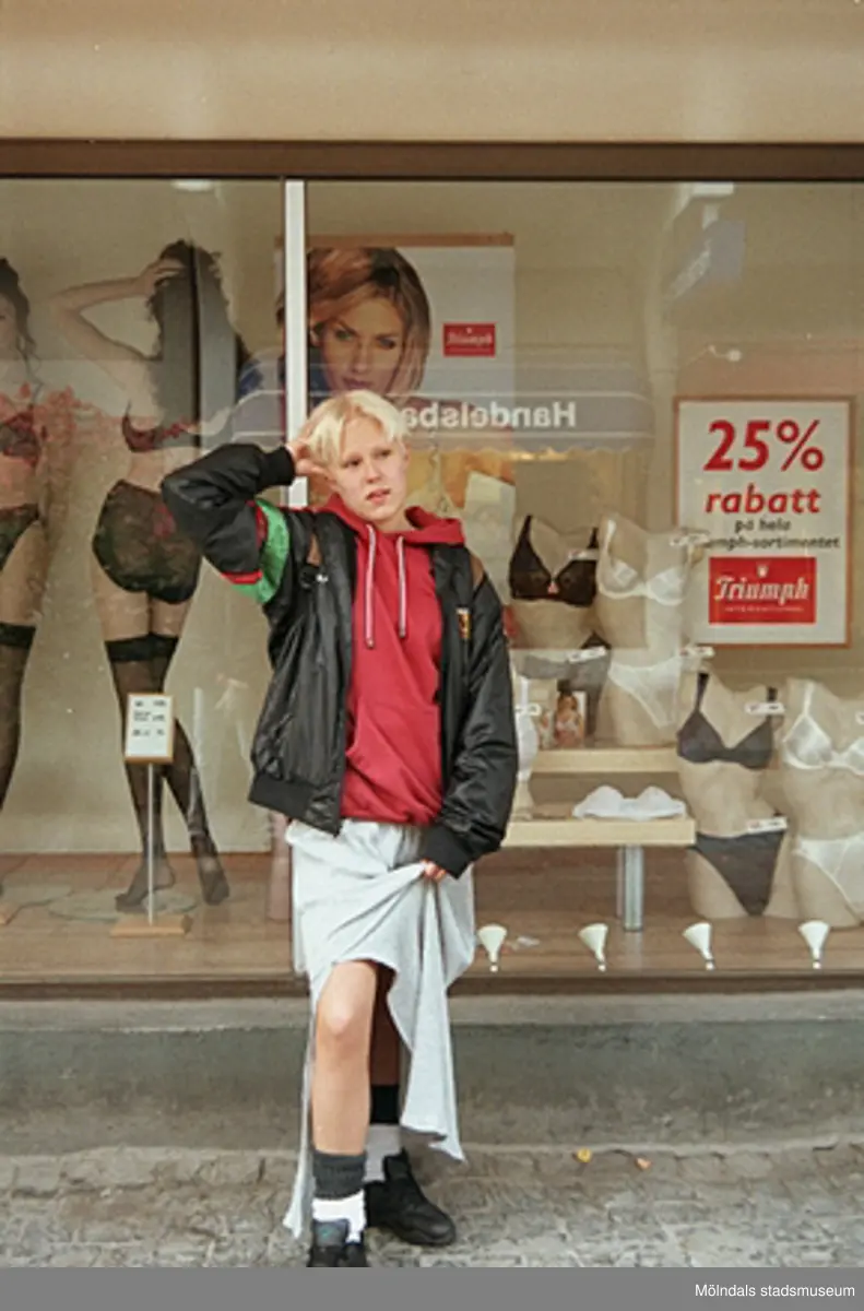 En ungdom posar utanför en butik på Brogatan. Mölndalsbro i dag - ett skolpedagogiskt dokumentationsprojekt på Mölndals museum under oktober 1996. 1996_1283-1300 är gjorda av högstadieelever från Åbyskolan 8A, grupp 3. Se även 1996_0913-0940, gruppbilder på klasserna 1996_1382-1405 och bilder från den färdiga utställningen 1996_1358-1381.