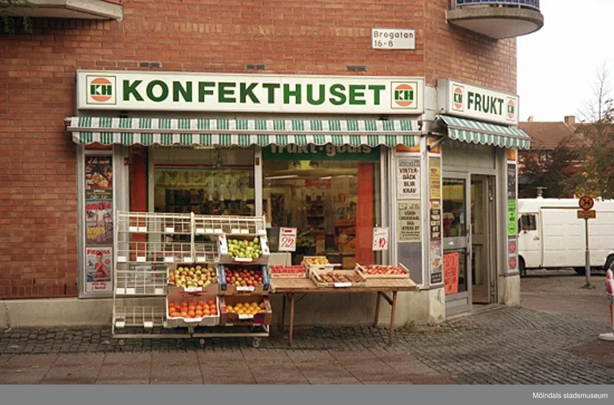 Konfekthuset på Brogatan 8. Mölndalsbro i dag - ett skolpedagogiskt dokumentationsprojekt på Mölndals museum under oktober 1996. 1996_1338-1356 är gjorda av högstadieelever från Åbyskolan 8A, grupp 6. Se även 1996_0913-0940, gruppbilder på klasserna 1996_1382-1405 och bilder från den färdiga utställningen 1996_1358-1381.