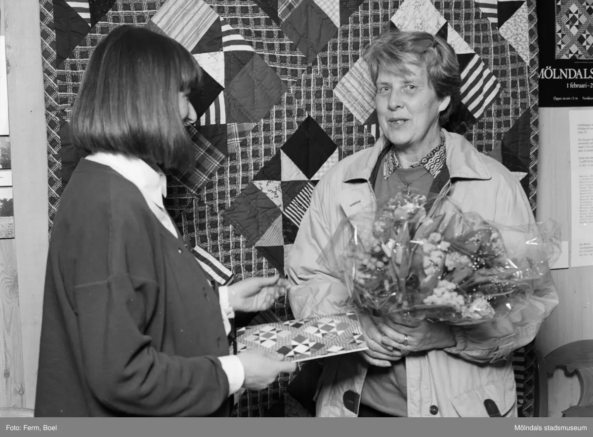 Interiörbilder från Mölndals Museums utställning "Lapptäcken, en kulturskatt" 1 feb - 29 mars 1992. Mari-Louise Olsson, museichef (1987-2008) och den 5000:e besökaren, Gertrud Eide.