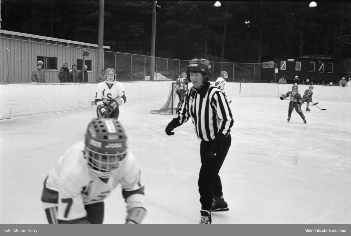 Titel: Kållereds SK ishockeylag 75:or möter ett "mammalag" på Kållereds isbana, år 1984. För mer information om bilden se under tilläggsinformation.