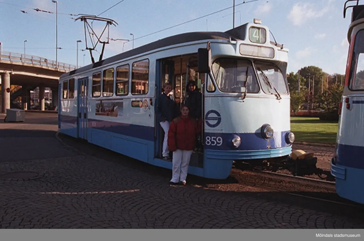 Spårvagn 4 vid Broplatsen (vändplats). På gräsmattan till höger byggdes senare SCA/Essity. Mölndalsbro i dag - ett skolpedagogiskt dokumentationsprojekt på Mölndals museum under oktober 1996. 1996_1098-1115 är gjorda av högstadieelever från Kvarnbyskolan 9C, grupp 5. Se även 1996_0913-0940, gruppbilder på klasserna 1996_1382-1405 samt bilder från den färdiga utställningen 1996_1358-1381.