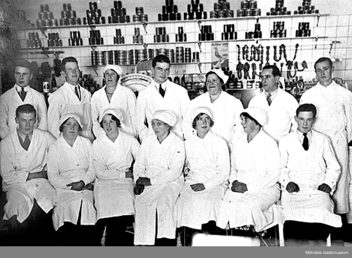 Personalen hos Nicklassons charkuteri, 1930-tal. Kvinnan i nedre radens mitt är givarens mor Hulda Nicklasson. På hennes vänstra sida sitter Ingrid Nicklasson. Mannen i övre radens mitt är Holger Nicklasson och längst ut till höger står