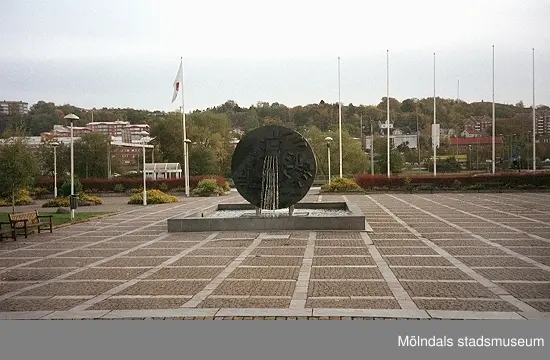 Vy österut på Stadshusplatsens fontän/skulptur och flaggstänger. Mölndalsbro i dag - ett skolpedagogiskt dokumentationsprojekt på Mölndals museum under oktober 1996. 1996_1338-1356 är gjorda av högstadieelever från Åbyskolan 8A, grupp 6. Se även 1996_0913-0940, gruppbilder på klasserna 1996_1382-1405 och bilder från den färdiga utställningen 1996_1358-1381.