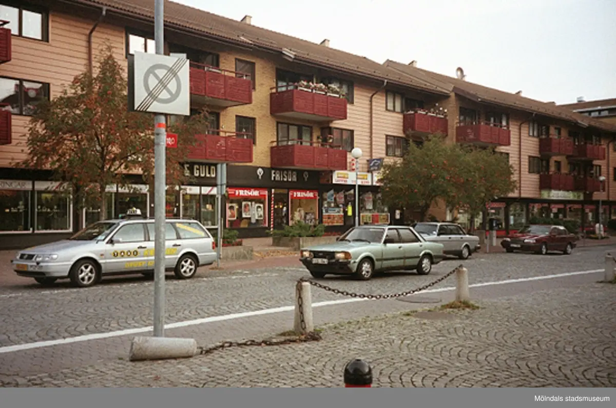 Kvarteret Gråsejen 6 (lägenheter/butiker) på Bergmansgatan. Mölndalsbro i dag - ett skolpedagogiskt dokumentationsprojekt på Mölndals museum under oktober 1996. 1996_1338-1356 är gjorda av högstadieelever från Åbyskolan 8A, grupp 6. Se även 1996_0913-0940, gruppbilder på klasserna 1996_1382-1405 och bilder från den färdiga utställningen 1996_1358-1381.