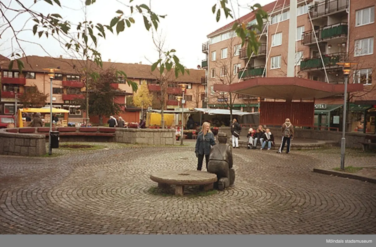 Ungdomar på Alberts torg/Mölndals torg. Mölndalsbro i dag - ett skolpedagogiskt dokumentationsprojekt på Mölndals museum under oktober 1996. 1996_1338-1356 är gjorda av högstadieelever från Åbyskolan 8A, grupp 6. Se även 1996_0913-0940, gruppbilder på klasserna 1996_1382-1405 och bilder från den färdiga utställningen 1996_1358-1381.