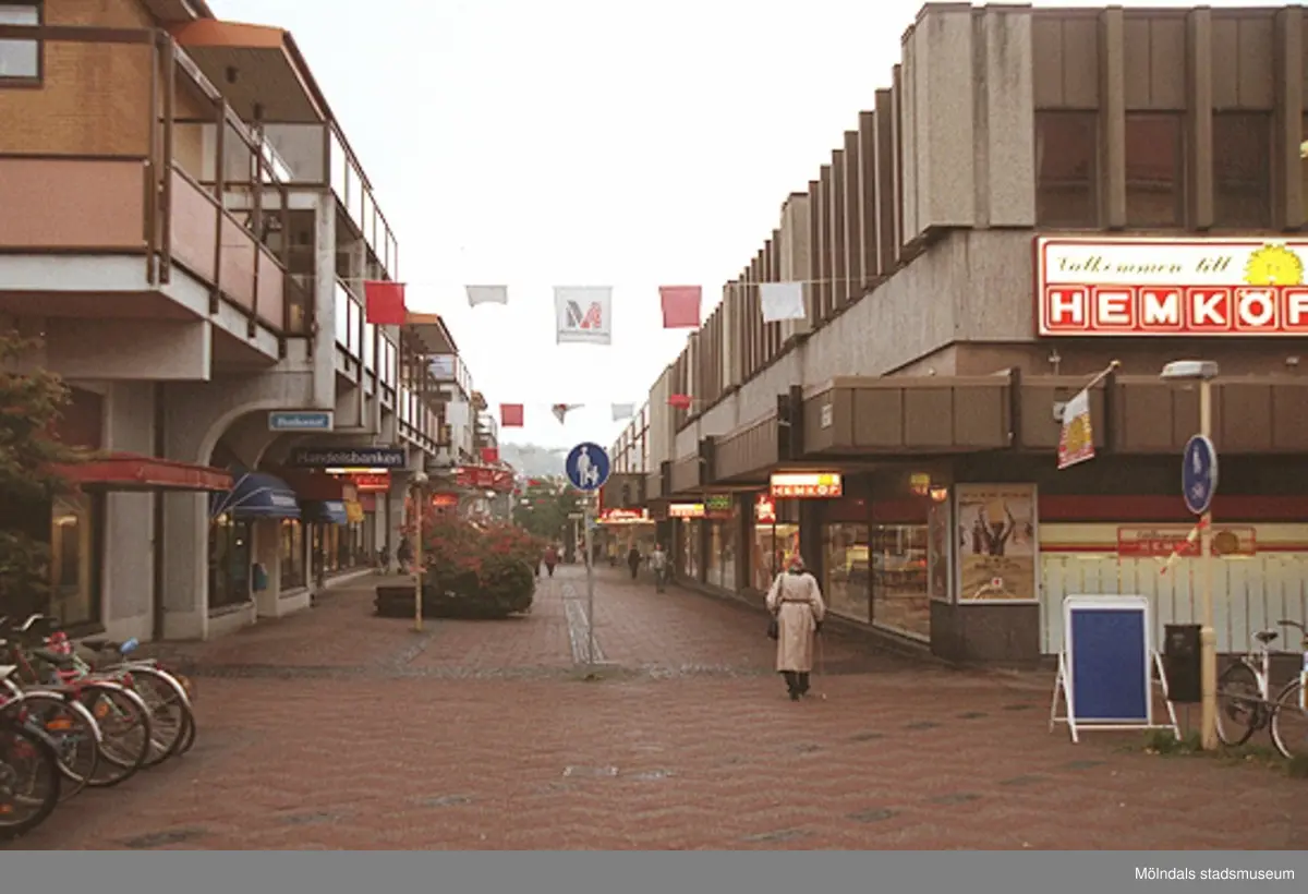 Brogatan österut. Mölndalsbro i dag - ett skolpedagogiskt dokumentationsprojekt på Mölndals museum under oktober 1996. 1996_1153-1171 är gjorda av högstadieelever från Kvarnbyskolan 9D, grupp 2. Se även 1996_0913-0940.