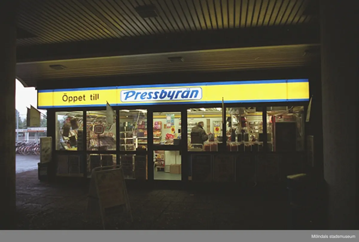 Pressbyrån under bron. Mölndalsbro i dag - ett skolpedagogiskt dokumentationsprojekt på Mölndals museum under oktober 1996. 1996_1135-1152 är gjorda av högstadieelever från Kvarnbyskolan 9D, grupp 1. Se även 1996_0913-0940, gruppbilder på klasserna 1996_1382-1405 samt bilder från den färdiga utställningen 1996_1358-1381.