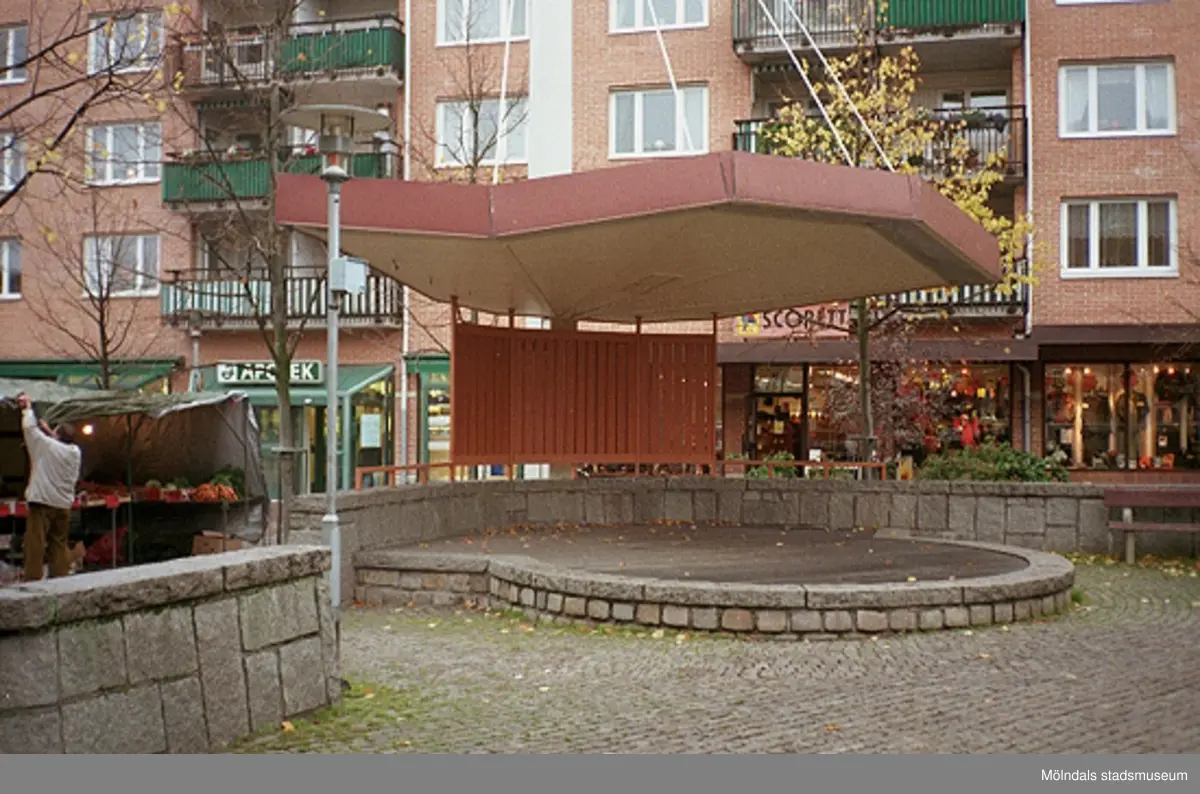Torghandel och en scen på Alberts torg. Mölndalsbro i dag - ett skolpedagogiskt dokumentationsprojekt på Mölndals museum under oktober 1996. 1996_1227-1245 är gjorda av högstadieelever från Kvarnbyskolan 9D, grupp 6. Se även 1996_0913-0940.