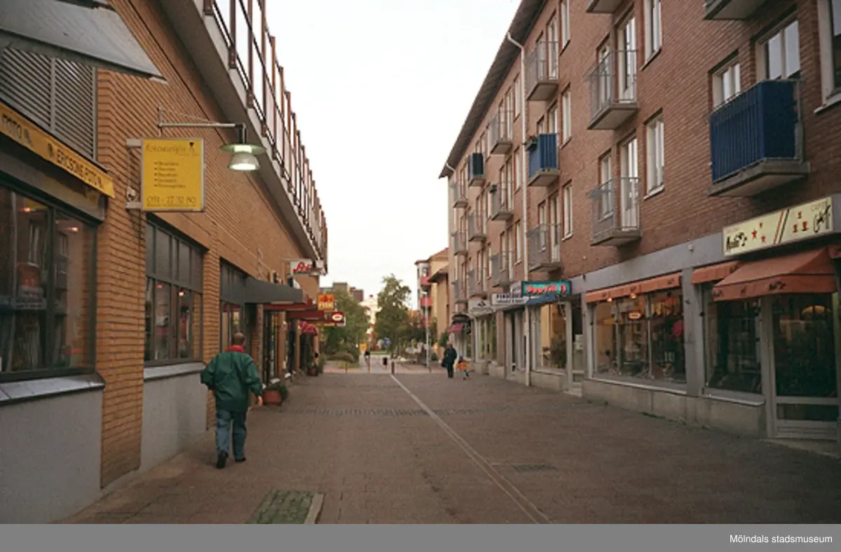 Medborgaregatan mot norr. Mölndalsbro i dag - ett skolpedagogiskt dokumentationsprojekt på Mölndals museum under oktober 1996. 1996_1338-1356 är gjorda av högstadieelever från Åbyskolan 8A, grupp 6. Se även 1996_0913-0940, gruppbilder på klasserna 1996_1382-1405 och bilder från den färdiga utställningen 1996_1358-1381.