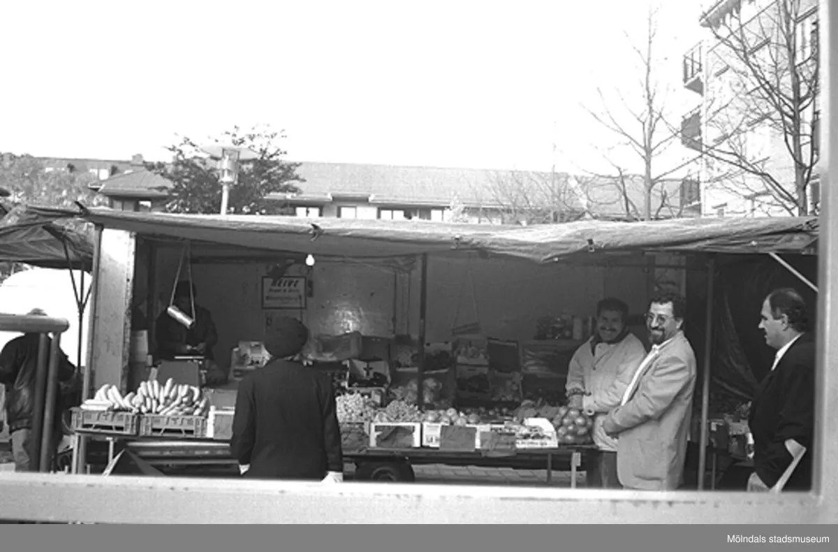 Torghandel på Alberts torg. Mölndalsbro i dag - ett skolpedagogiskt dokumentationsprojekt på Mölndals museum under oktober 1996. 1996_0968-0986 är gjorda av högstadieelever från Kvarnbyskolan 9A, grupp 4. Se även 1996_0913-0940, gruppbilder på klasserna 1996_1382-1405 samt bilder från den färdiga utställningen 1996_1358-1381.