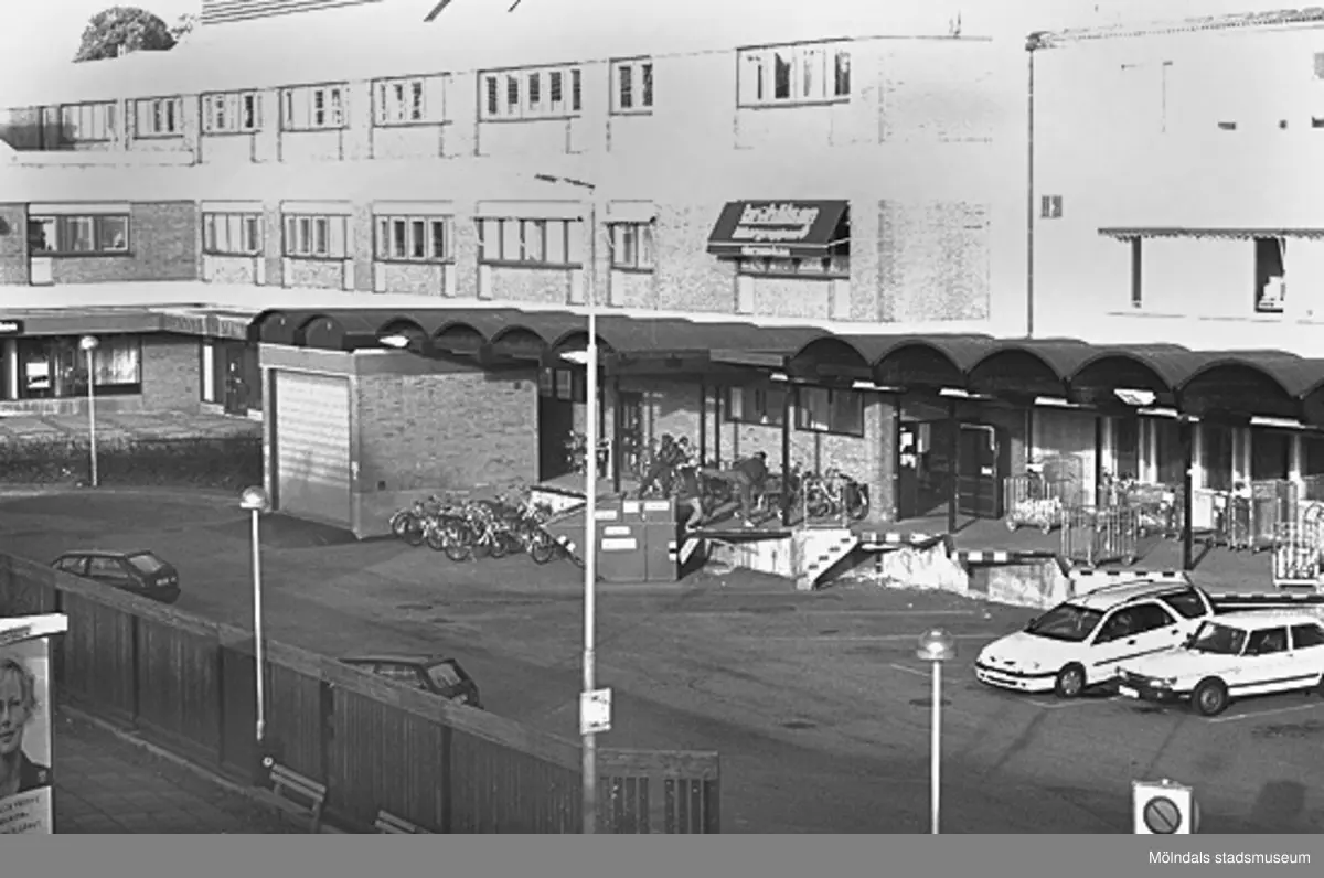 Vy från Mölndals bro mot Broplatsen. Mölndalsbro i dag - ett skolpedagogiskt dokumentationsprojekt på Mölndals museum under oktober 1996. 1996_1024-1041 är gjorda av högstadieelever från Kvarnbyskolan 9C, grupp 1. Se även 1996_0913-0940, gruppbilder på klasserna 1996_1382-1405 samt bilder från den färdiga utställningen 1996_1358-1381.