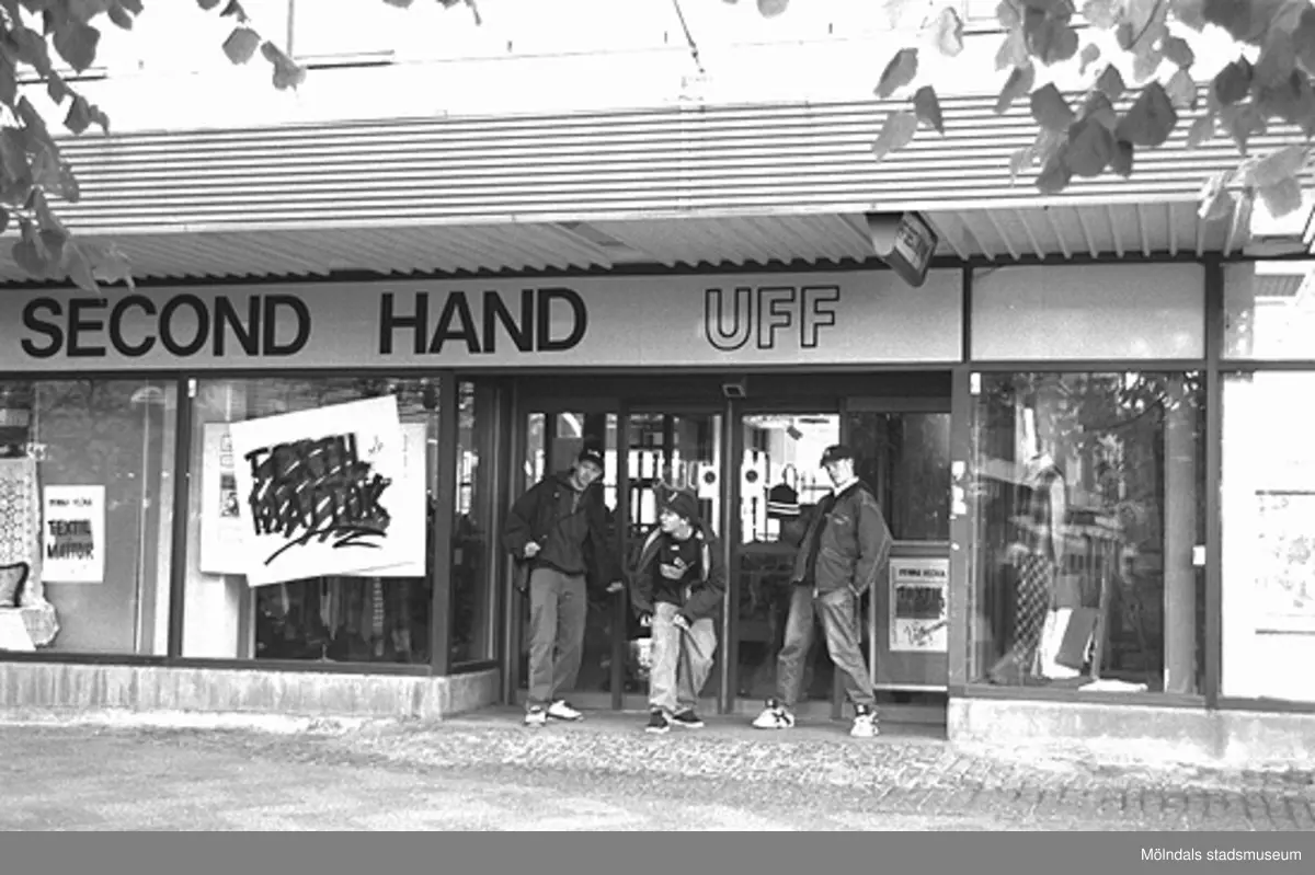 Second Hand UFF på Brogatans södra sida. Mölndalsbro i dag - ett skolpedagogiskt dokumentationsprojekt på Mölndals museum under oktober 1996. 1996_1024-1041 är gjorda av högstadieelever från Kvarnbyskolan 9C, grupp 1. Se även 1996_0913-0940, gruppbilder på klasserna 1996_1382-1405 samt bilder från den färdiga utställningen 1996_1358-1381.