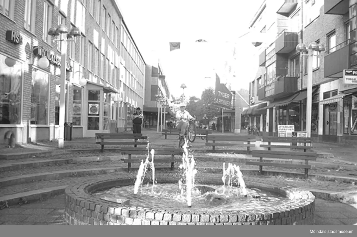 Fontän i början av Brogatan. Mölndalsbro i dag - ett skolpedagogiskt dokumentationsprojekt på Mölndals museum under oktober 1996. 1996_1079-1097 är gjorda av högstadieelever från Kvarnbyskolan 9C, grupp 4. Se även 1996_0913-0940, gruppbilder på klasserna 1996_1382-1405 samt bilder från den färdiga utställningen 1996_1358-1381.