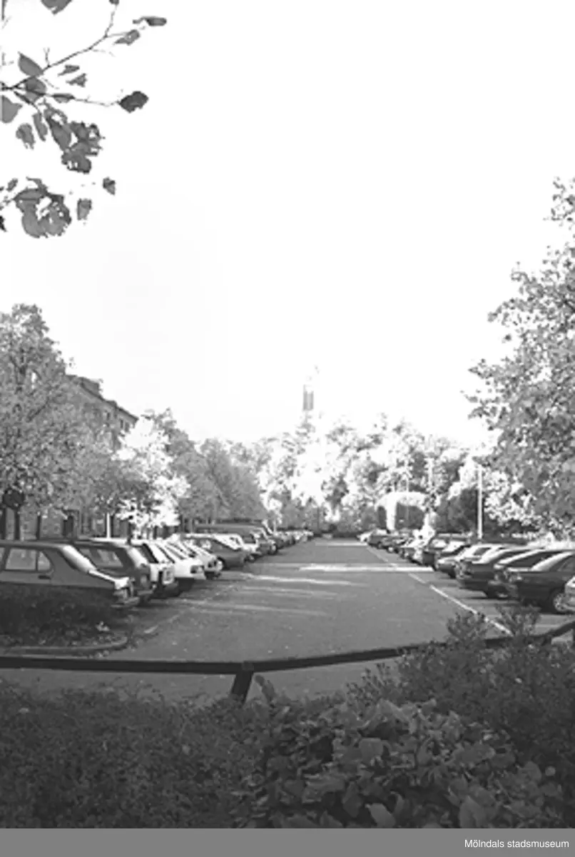 Parkering mellan Tempelgatan och Stadshusparken. Mölndalsbro i dag - ett skolpedagogiskt dokumentationsprojekt på Mölndals museum under oktober 1996. 1996_1079-1097 är gjorda av högstadieelever från Kvarnbyskolan 9C, grupp 4. Se även 1996_0913-0940, gruppbilder på klasserna 1996_1382-1405 samt bilder från den färdiga utställningen 1996_1358-1381.