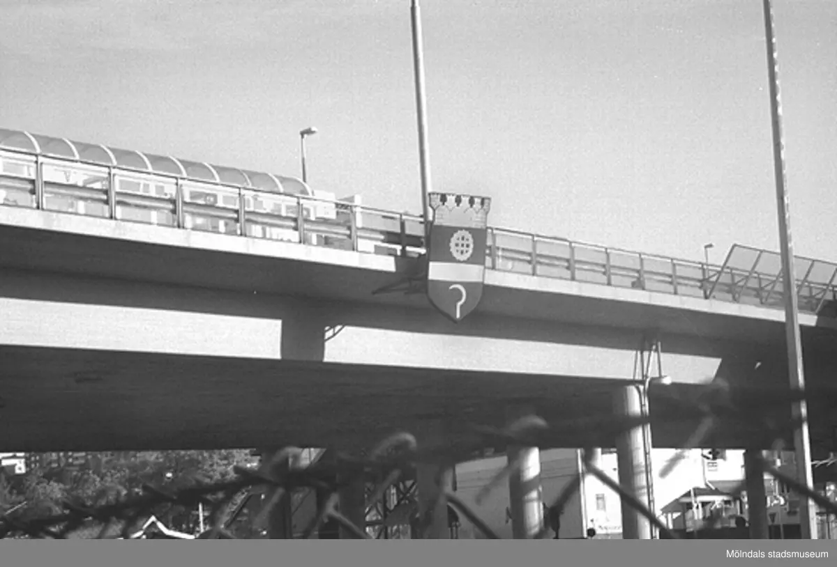 Stadsvapnet/kommunvapnet uppsatt på bron. Mölndalsbro i dag - ett skolpedagogiskt dokumentationsprojekt på Mölndals museum under oktober 1996. 1996_1079-1097 är gjorda av högstadieelever från Kvarnbyskolan 9C, grupp 4. Se även 1996_0913-0940, gruppbilder på klasserna 1996_1382-1405 samt bilder från den färdiga utställningen 1996_1358-1381.