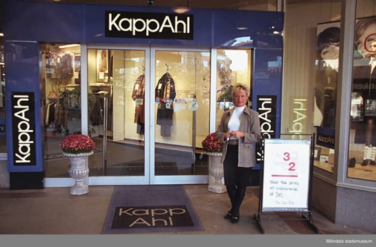 En dam poserar utanför KappAhls på Brogatan. Mölndalsbro i dag - ett skolpedagogiskt dokumentationsprojekt på Mölndals museum under oktober 1996. 1996_1116-1134 är gjorda av högstadieelever från Kvarnbyskolan 9C, grupp 6. Se även 1996_0913-0940, gruppbilder på klasserna 1996_1382-1405 samt bilder från den färdiga utställningen 1996_1358-1381.