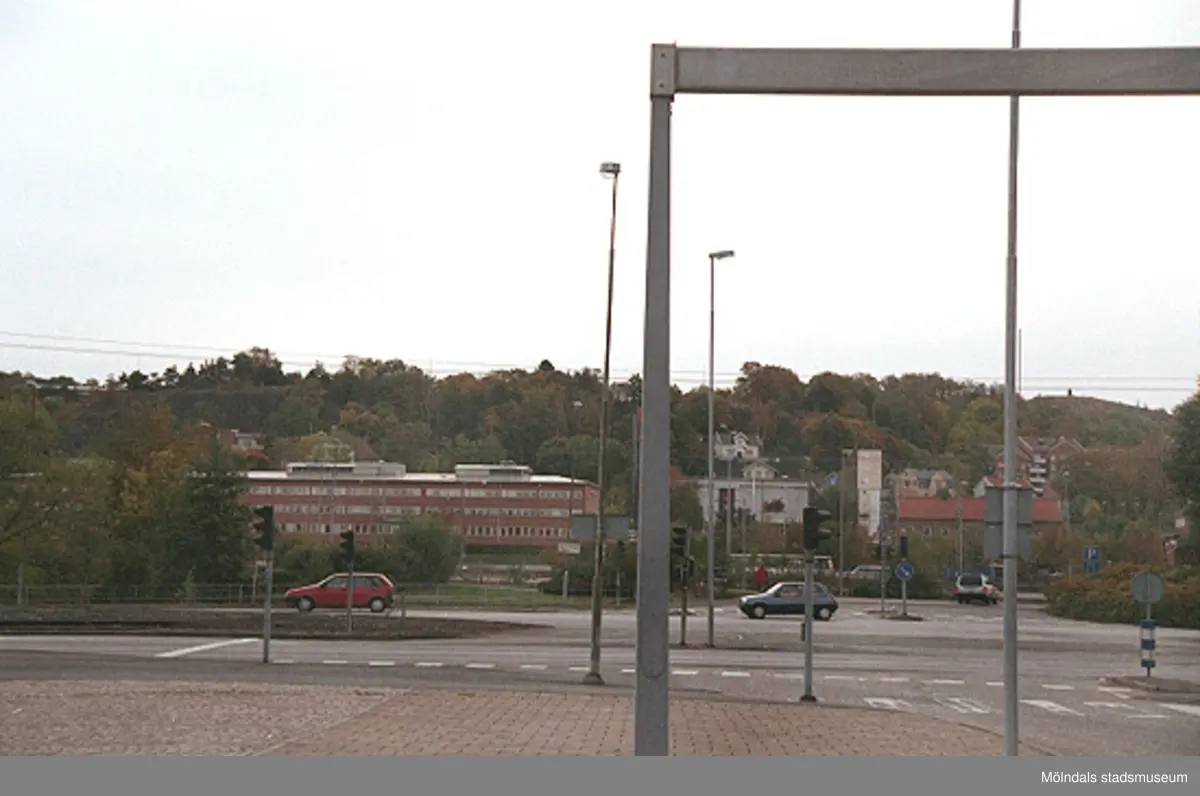 Vy österut på korsningen Tempelgatan/Göteborgsvägen. Mölndalsbro i dag - ett skolpedagogiskt dokumentationsprojekt på Mölndals museum under oktober 1996. 1996_1246-1263 är gjorda av högstadieelever från Åbyskolan 8A, grupp 1. Se även 1996_0913-0940, gruppbilder på klasserna 1996_1382-1405 och bilder från den färdiga utställningen 1996_1358-1381.