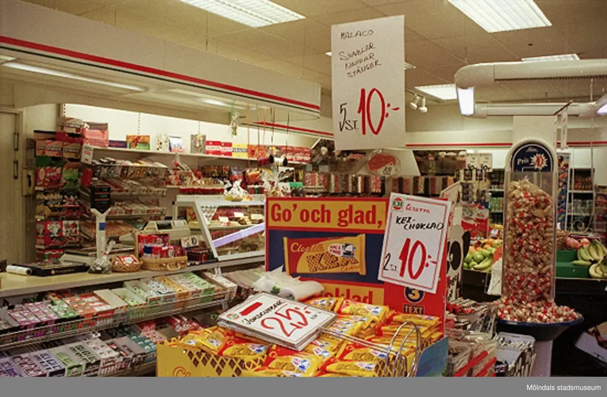 Interiör i Konfekthuset på Brogatan. Mölndalsbro i dag - ett skolpedagogiskt dokumentationsprojekt på Mölndals museum under oktober 1996. 1996_1301-1319 är gjorda av högstadieelever från Åbyskolan 8A, grupp 4. Se även 1996_0913-0940, gruppbilder på klasserna 1996_1382-1405 och bilder från den färdiga utställningen 1996_1358-1381.