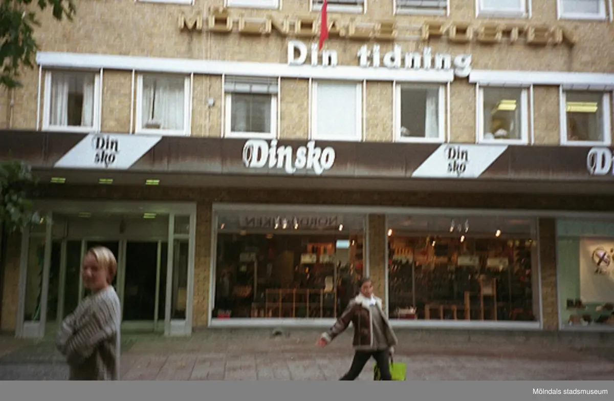 Din Sko och Mölndals-Posten på Brogatan 16. Mölndalsbro i dag - ett skolpedagogiskt dokumentationsprojekt på Mölndals museum under oktober 1996. 1996_1320-1337 är gjorda av högstadieelever från Åbyskolan 8A, grupp 5. Se även 1996_0913-0940, gruppbilder på klasserna 1996_1382-1405 och bilder från den färdiga utställningen 1996_1358-1381.