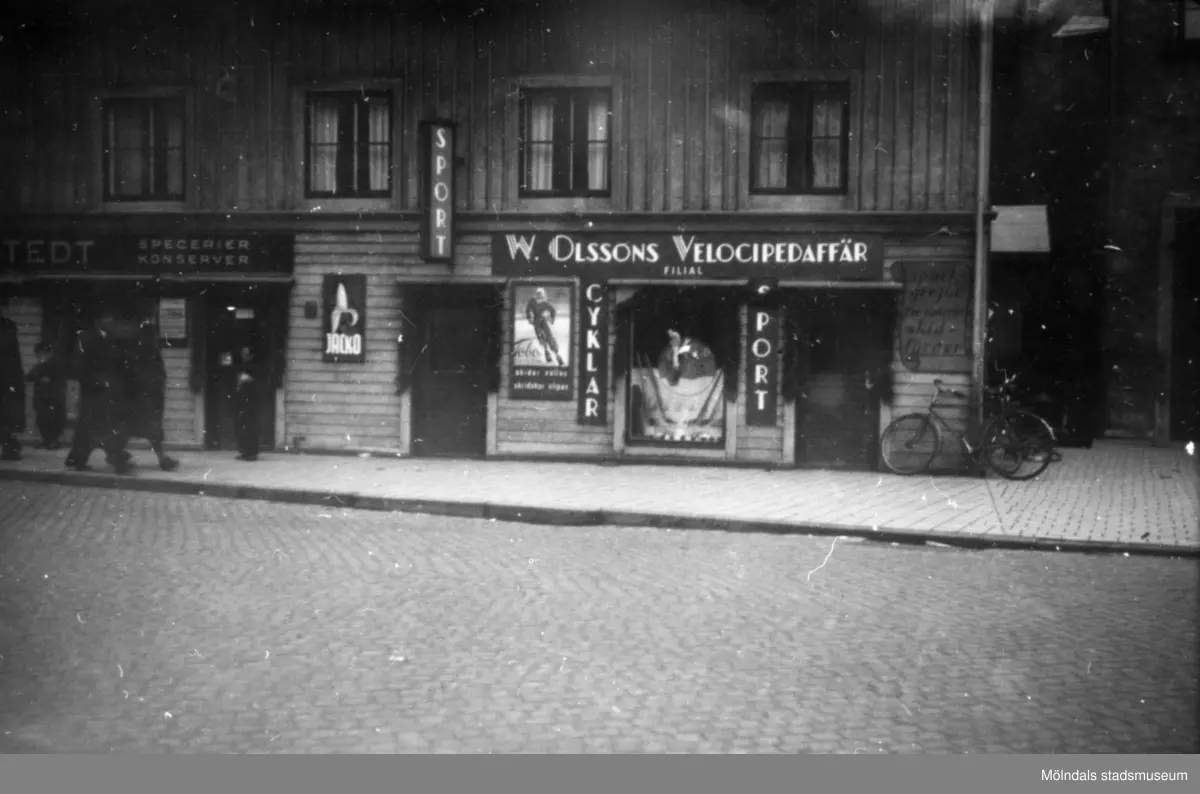 "I detta hus fanns William Olssons velocipedaffär i högra ändan. Bertil och William var bröder och hade varsin cykelaffär. Till vänster i huset låg J. Nundstedts speceriaffär. I övervåningen fanns Stadsingenjörskontorets mätningsavdelning i en f.d. lägenhet. Där arbetade kartriterskorna och mätningspersonalen. Jag arbetade själv där från sept. 1957 till 1961 som mätningshantlangare (s.k. pinnpojk). Men jag arbetade mestadels med att kopiera ritningar och kartor. De flesta kopiorna belystes på ljuskänsligt gult papper som sedan framkallades med ammoniak. Fy vad det luktade hemskt när jag tömde upp ammoniak från en plastdunk i den öppna ammoniakbehållaren. Då fick man snabbt springa till det öppna fönstret och kippa efter andan. Någon gång 1961 flyttade vi in i det nuvarande Stadshuset. Huset revs i samband med ombyggnad av Kvarnbygatan."