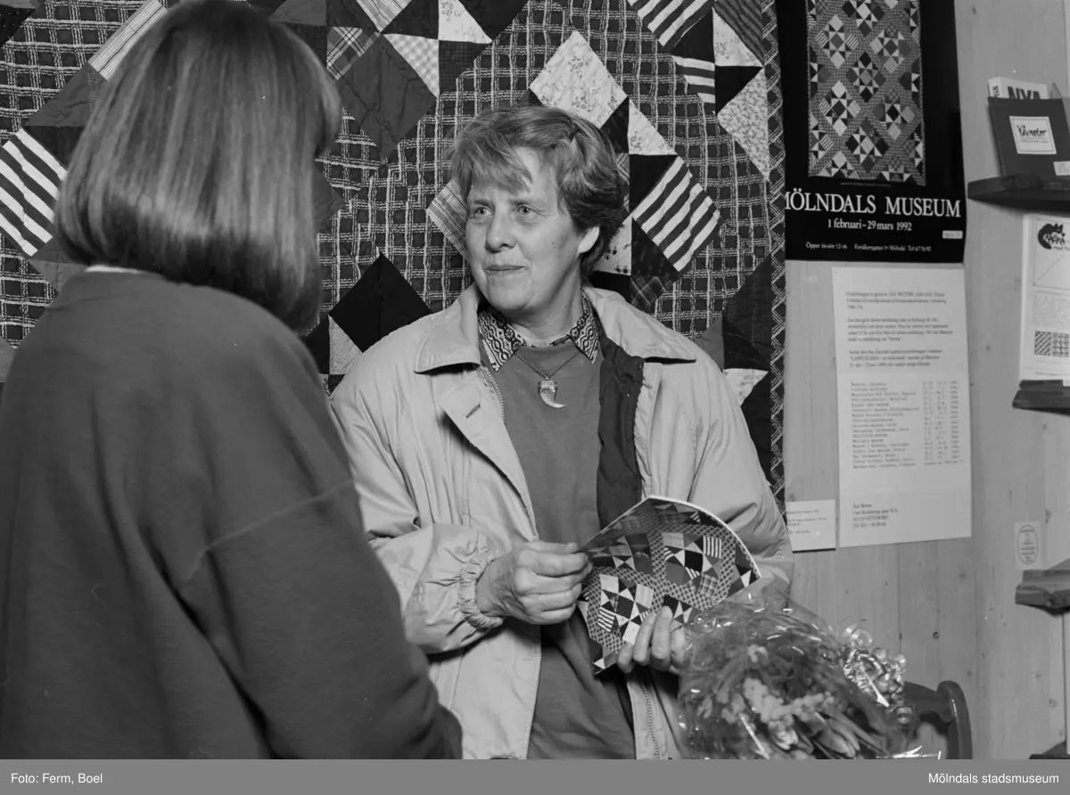 Interiörbilder från Mölndals Museums utställning "Lapptäcken, en kulturskatt" 1 feb - 29 mars 1992. Mari-Louise Olsson, museichef (1987-2008) och den 5000:e besökaren, Gertrud Eide.