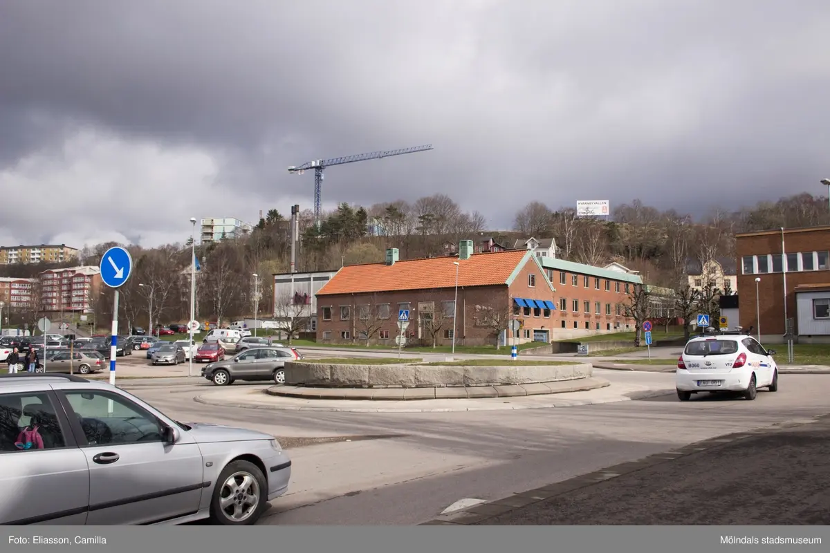 Mölndals brandstation sedd från rondellen på Järnvägsgatan mot Torggatan. Till höger ligger Kvarnbyskolan. På höjden ser man en lyftkran vid nybygget av lägenheterna på Kvarnbyvallen. Det röda tegelfärgade bostadsområdet till höger ligger på Torggatan 64.