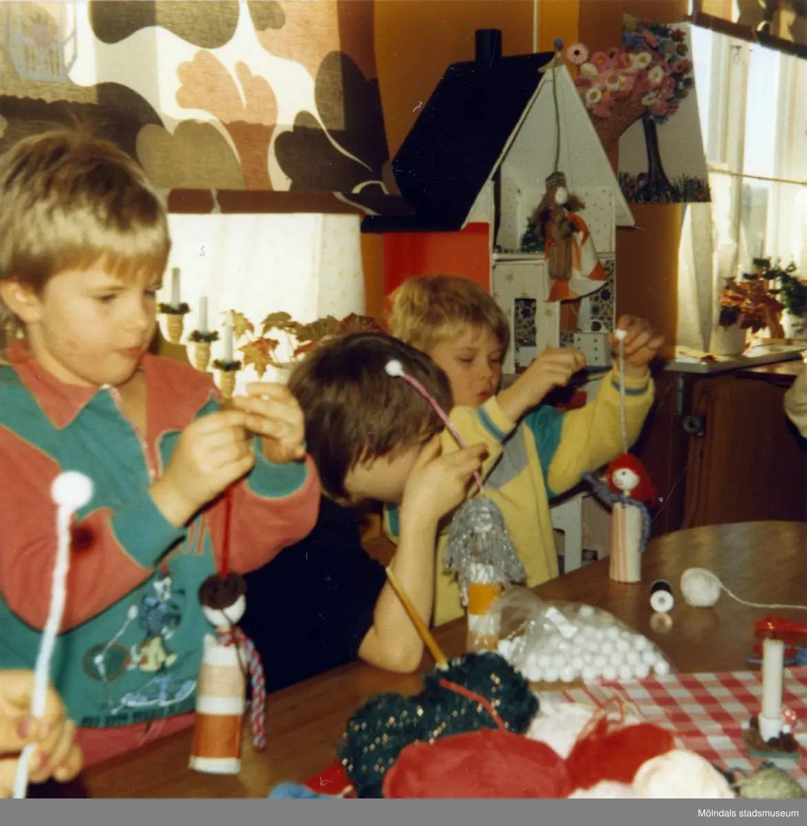 Dagisbarnens egna dockor. Dockteater hos Hällesåker deltidsgrupp 1986-12-11. Fotografi ur album tillhörande Blanka Kaplan.