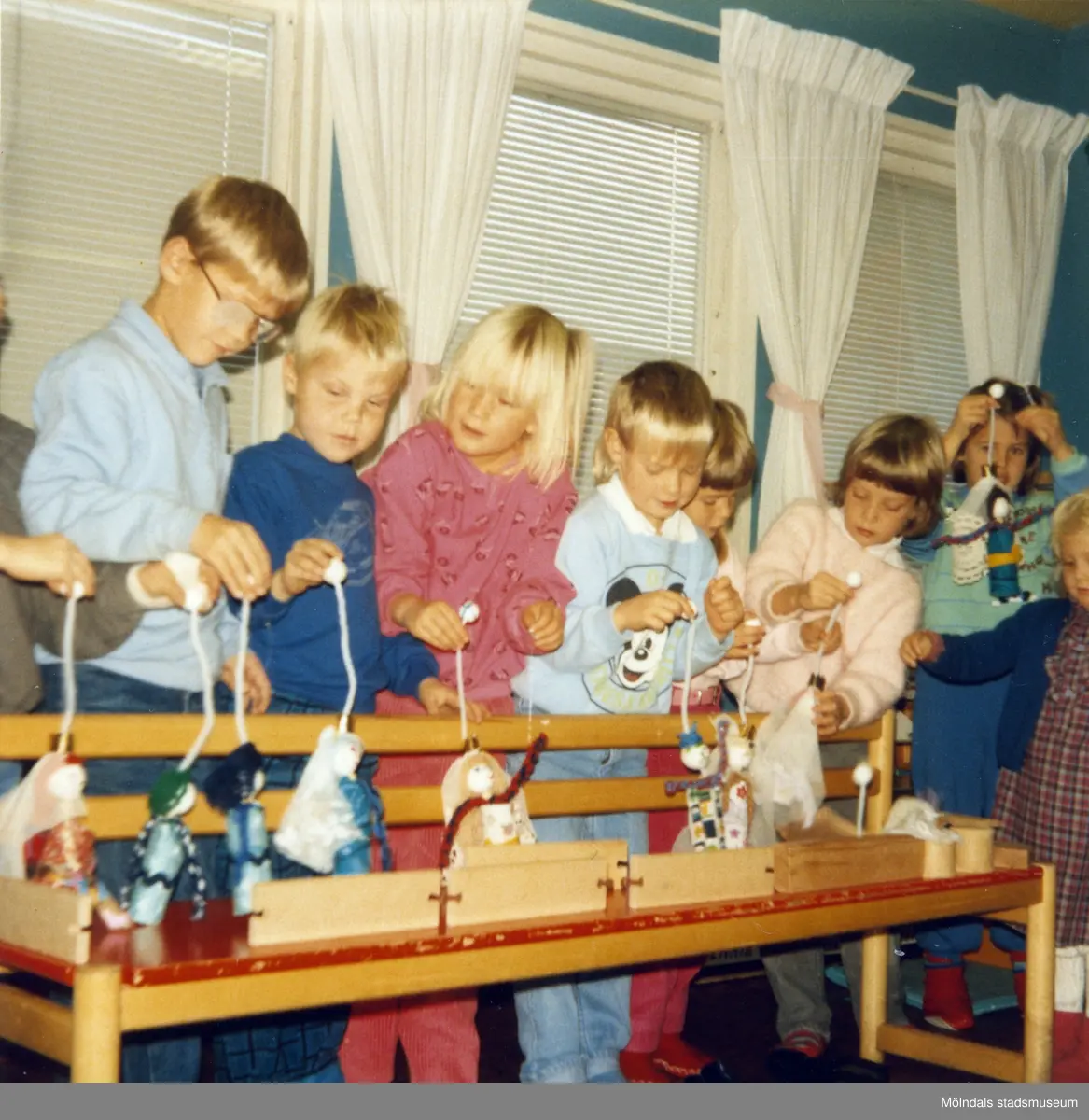 Dagisbarnens egna dockor. Dockteater hos Vommedalens deltidsgrupp 1986-11-07. Fotografi ur album tillhörande Blanka Kaplan.