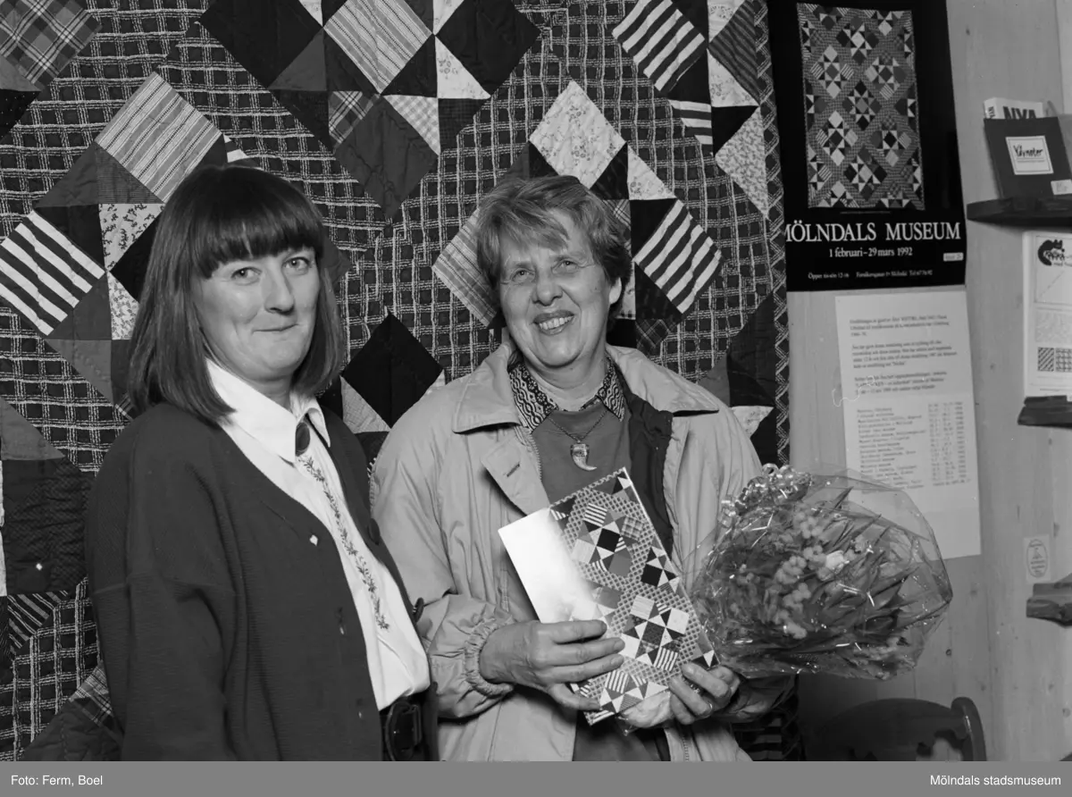 Titel: Interiörbilder från Mölndals Museums utställning "Lapptäcken, en kulturskatt" 1 feb - 29 mars 1992. Mari-Louise Olsson, museichef (1987-2008) och den 5000:e besökaren, Gertrud Eide.