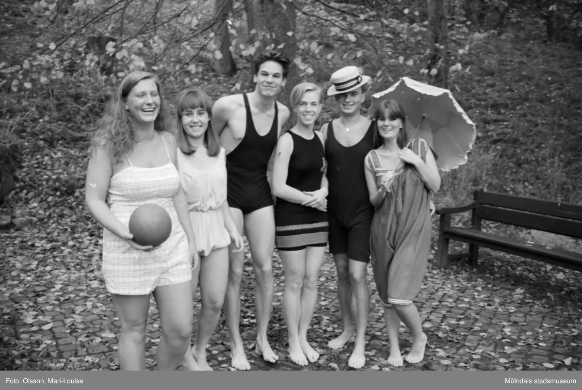Titel: Familjesöndag, 1992 på Mölndals museum, i samband med utställningen "Gammalt skräp". Man ser barnverkstad med käpphästtillverkning, mannekänguppvisning med baddräkter samt paneldiskussion om "samlande".