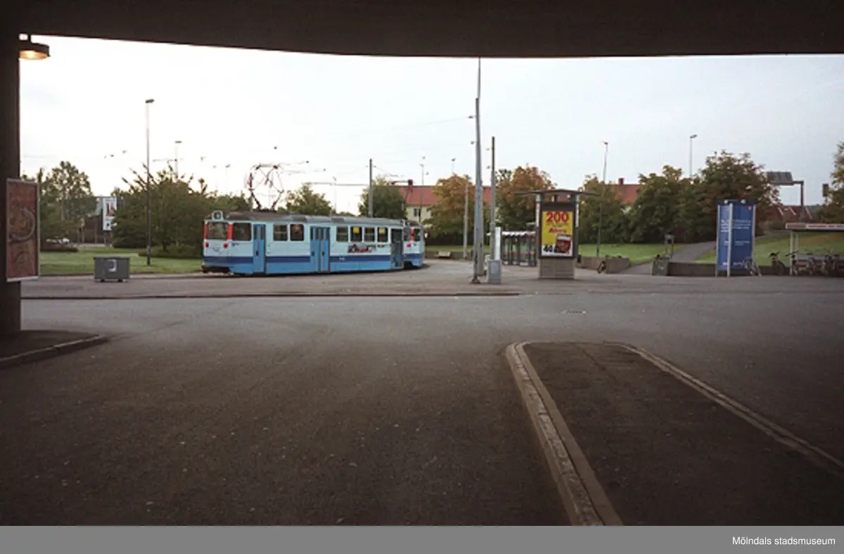 Spårvägens vändslinga vid Broplatsen. Mölndalsbro i dag - ett skolpedagogiskt dokumentationsprojekt på Mölndals museum under oktober 1996. 1996_1338-1356 är gjorda av högstadieelever från Åbyskolan 8A, grupp 6. Se även 1996_0913-0940, gruppbilder på klasserna 1996_1382-1405 och bilder från den färdiga utställningen 1996_1358-1381.