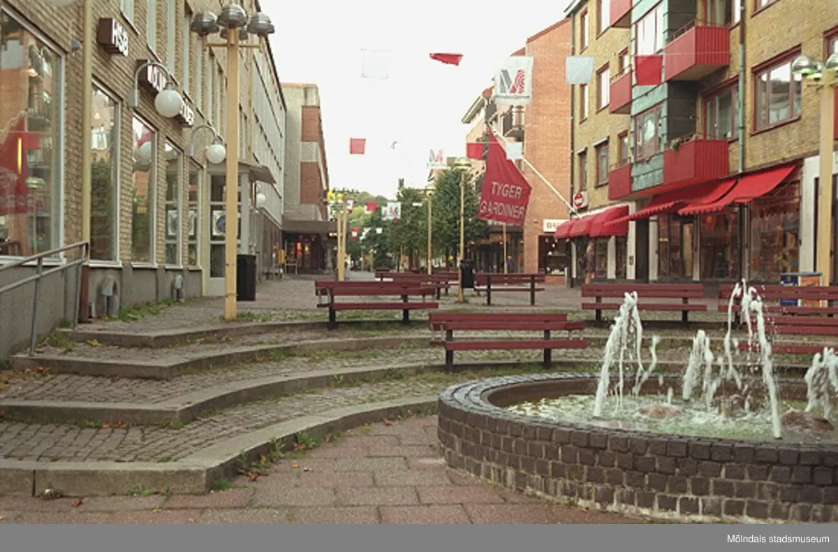 Vy västerut på Brogatan och dess fontän. Mölndalsbro i dag - ett skolpedagogiskt dokumentationsprojekt på Mölndals museum under oktober 1996. 1996_1301-1319 är gjorda av högstadieelever från Åbyskolan 8A, grupp 4. Se även 1996_0913-0940, gruppbilder på klasserna 1996_1382-1405 och bilder från den färdiga utställningen 1996_1358-1381.