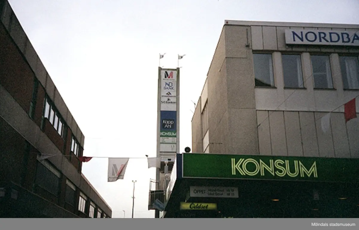 Hisschakt från Nygatan till Konsums p-däck. Mölndalsbro i dag - ett skolpedagogiskt dokumentationsprojekt på Mölndals museum under oktober 1996. 1996_1338-1356 är gjorda av högstadieelever från Åbyskolan 8A, grupp 6. Se även 1996_0913-0940, gruppbilder på klasserna 1996_1382-1405 och bilder från den färdiga utställningen 1996_1358-1381.