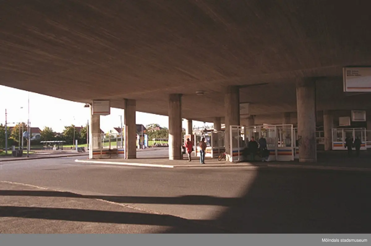 Människor vid busskurer under bron. Mölndalsbro i dag - ett skolpedagogiskt dokumentationsprojekt på Mölndals museum under oktober 1996. 1996_1116-1134 är gjorda av högstadieelever från Kvarnbyskolan 9C, grupp 6. Se även 1996_0913-0940, gruppbilder på klasserna 1996_1382-1405 samt bilder från den färdiga utställningen 1996_1358-1381.