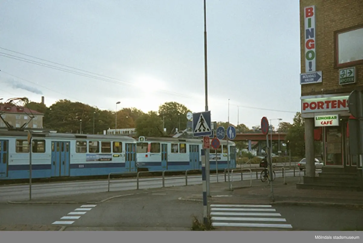 Vy över Bergmansgatan mot Göteborgsvägen och bron. 4:ans spårvagn kör mot Göteborg. Mölndalsbro i dag - ett skolpedagogiskt dokumentationsprojekt på Mölndals museum under oktober 1996. 1996_1320-1337 är gjorda av högstadieelever från Åbyskolan 8A, grupp 5. Se även 1996_0913-0940, gruppbilder på klasserna 1996_1382-1405 och bilder från den färdiga utställningen 1996_1358-1381.