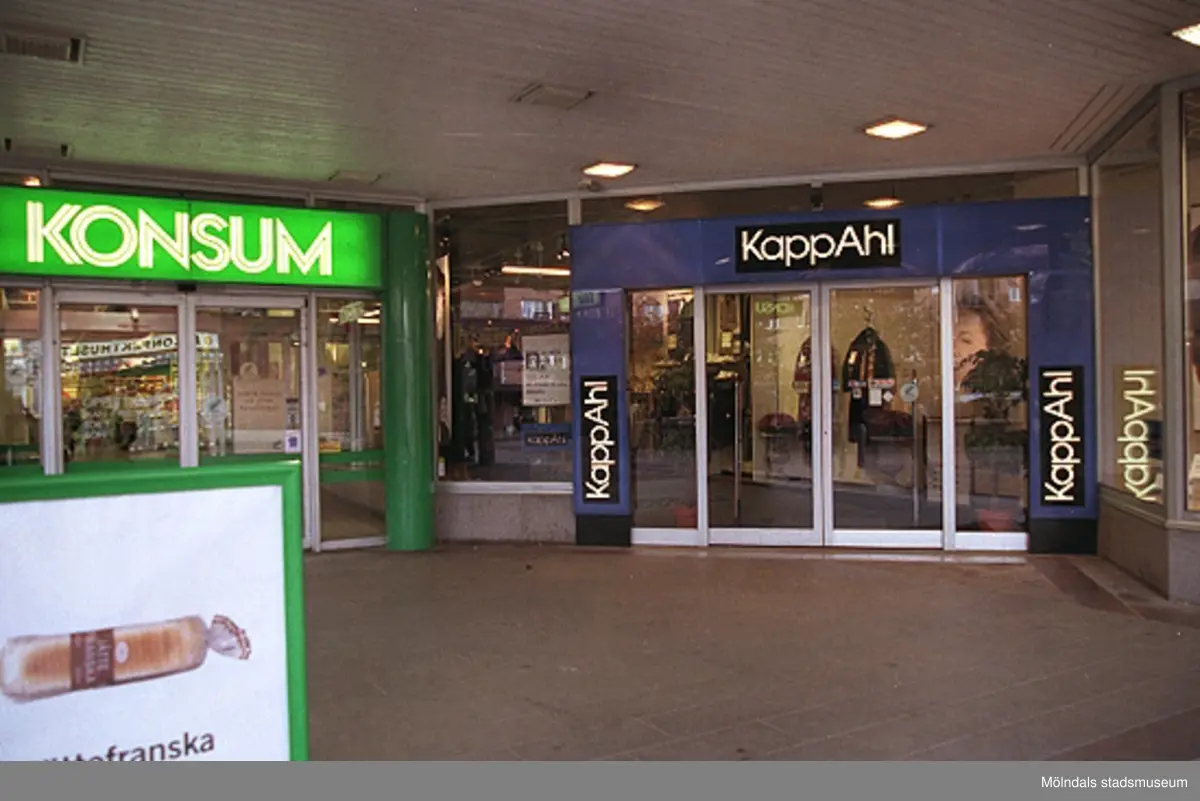 Entrén till Konsum och KappAhl från Nygatan/Brogatan. Mölndalsbro i dag - ett skolpedagogiskt dokumentationsprojekt på Mölndals museum under oktober 1996. 1996_1264-1282 är gjorda av högstadieelever från Åbyskolan 8A, grupp 2. Se även 1996_0913-0940, gruppbilder på klasserna 1996_1382-1405 och bilder från den färdiga utställningen 1996_1358-1381.
