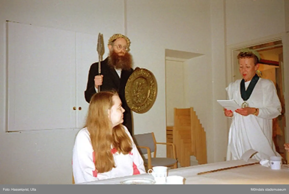 Lars Gahrn och Pia Persson uppvaktar vid avtackningen av receptionist Kim Linder på Mölndals museum 1994.