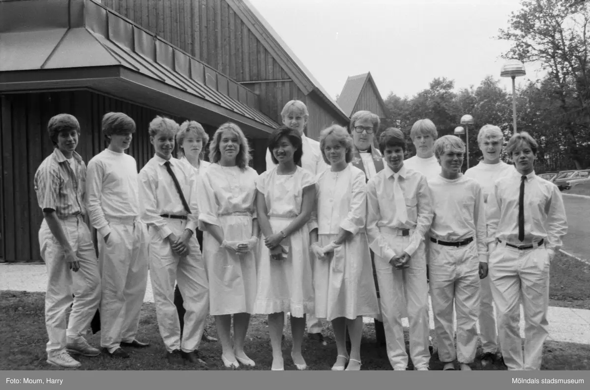 Konfirmation i Apelgårdens kyrka i Kållered, år 1984. "Göran Johansson tillsammans med sina sommarkonfirmander utanför Apelgårdens kyrka."