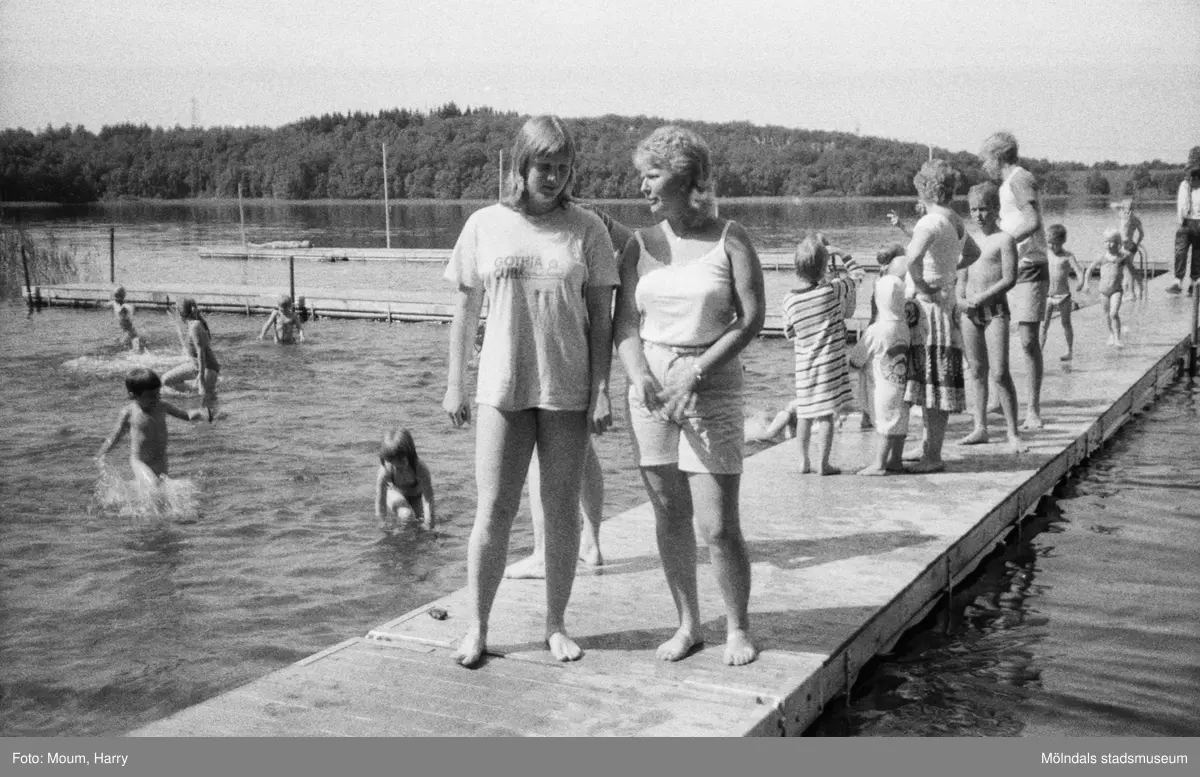 Simskola vid Tulebosjön i Kållered, år 1983. "Simlärare Helen Ahlberg och Anita Hidstedt bland glada och simhungriga småttingar vid Tulebosjön."